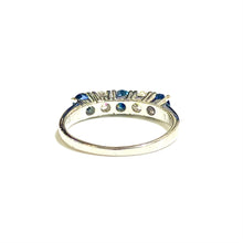 The sapphires and diamonds are expertly set in a bridge design, adding a unique touch to the ring. The 18ct gold stamp ensures the authenticity and quality of the materials used.
