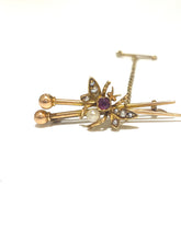 Our Antique 18ct Gold Seed Pearl and Ruby Brooch with Pin is a stunning piece of jewellery that showcases intricate craftsmanship and timeless elegance. The brooch features an exquisite insect design, with the body and wings made up of delicate seed pearls and a vibrant ruby.