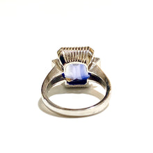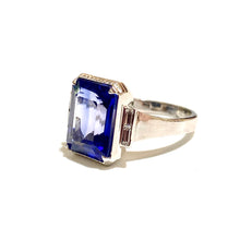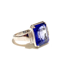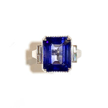 Featuring a breathtaking 9.26ctw synthetic sapphire, this ring showcases a vibrant violet hue that is sure to catch everyone's attention. Surrounding the sapphire are dazzling diamond baguettes, adding a touch of sparkle and glamour to the design.