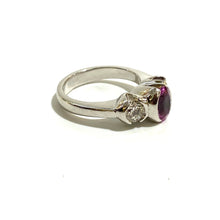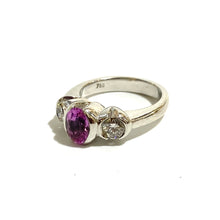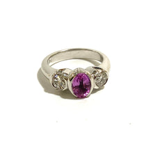 A beautiful 18ct white gold 1.00ct oval cut natural Pink Sapphire centering 2 round brilliant cut diamonds ring.