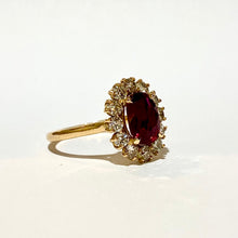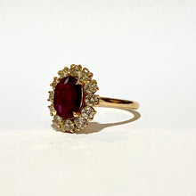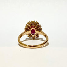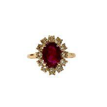 This 18ct yellow Gold, Ruby and Brilliant cut Diamond Ring is a stunning piece of jewellery that features a 2.11ct claw set Ruby, centring twelve round brilliant cut claw set Diamonds, totalling 0.62ct. Made with high quality materials, this ring is sure to add a touch of elegance and sophistication to any outfit. Elevate your style with this beautiful trilogy ring.