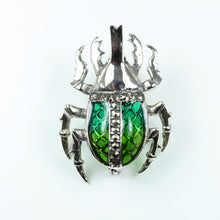 The intricate design features a scarab bug, a symbol of rebirth and protection in ancient Egyptian culture. The bug is beautifully crafted with sterling silver and green enamel, creating a striking contrast that catches the eye.