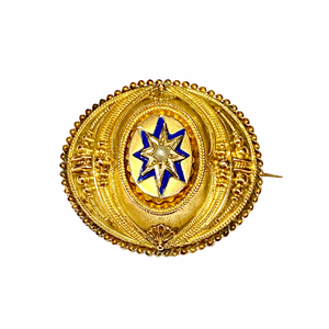 Antique 9ct Gold Seed Pearl and Blue Enamel Victorian Mourning Brooch
