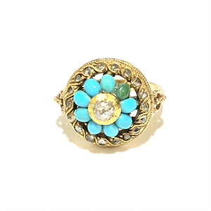 Antique 9ct Rose Gold, Yellow Diamond and Turquoise Dress Ring
