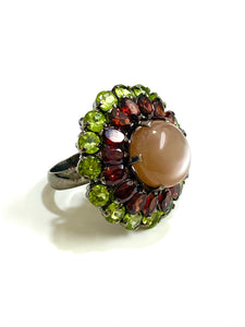 Sterling Silver Black Rhodium Plate Moonstone Garnet and Peridot Ring