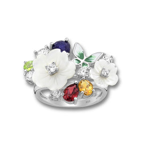 925 Sterling Silver Flower and Butterfly Ring, Decorated with Shell and Blue Sapphire