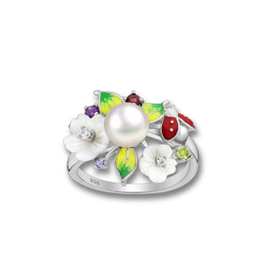 925 Sterling Silver Flower and Ladybug Ring, Decorated with Shell, Freshwater Pearl