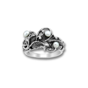 Sterling Silver Oxidized Leaf Ring, Decorated with Freshwater Pearls