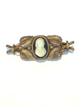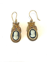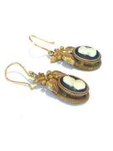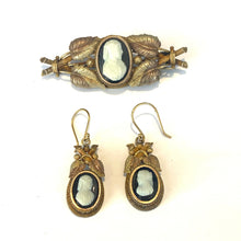 14ct Gold Antique Black and White Hardstone Cameo Set is a stunning jewelry set featuring a brooch and a pair of earrings, crafted in 14ct gold with a rose leaf design and adorned with a black and white hardstone cameo.