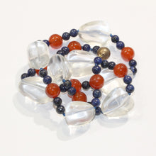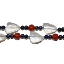 Our Carnelian, Lapis Lazuli and Rock Crystal Necklace is a stunning piece that combines the natural beauty of gemstones with expert craftsmanship. This necklace features a pattern of vibrant Carnelian, deep blue Lapis Lazuli, and clear Rock Crystal beads, all strung and knotted on luxurious silk.