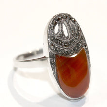 The Carnelian stone, surrounded by Marcasite, adds a touch of sophistication and glamour to the ring. The rich red-orange hue of the Carnelian stone is eye-catching and complements a wide range of skin tones.