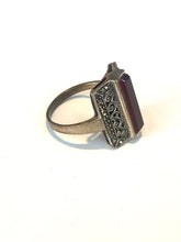 The centrepiece of this ring is a beautiful rectangular carnelian gemstone. Carnelian is known for its vibrant orangey-brown colour and is believed to have properties that promote courage and creativity. Surrounding the carnelian gemstone are small marcasite stones, adding a touch of sparkle and elegance to the design.