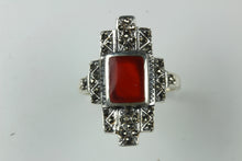 The carnelian gemstone is known for its vibrant orangey-brown colour and is believed to have protective properties. It is also said to enhance creativity and boost confidence. Combined with the shimmering marcasite stones, this ring is a true statement piece that will catch the eye.