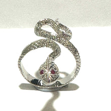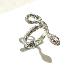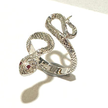 This stunning ring is crafted from 9ct white gold and features intricate detailing of a snake with vibrant ruby eyes, making it a unique and eye-catching accessory. The snake symbolizes eternity and is a timeless piece that adds a touch of mystique to any outfit.