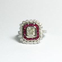 Our Cushion Cut Diamond and Ruby Cocktail Ring is a gorgeous piece of jewellery that combines the elegance of diamonds with the vibrant beauty of rubies. This ring features a 9ct white gold band adorned with a 1.02ct cushion cut diamond at the centre, surrounded by a row of channel-set French cut rubies. The diamonds on the band are brilliant cut and bezel set, adding extra sparkle to the design.