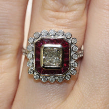 The Cushion Cut Diamond and Ruby Cocktail Ring is available in size N 1/2 and weighs 3.81g. The diamonds in this ring have a colour range of H-J and a clarity range of SI-I, while the centre diamond has a colour of J and a clarity of SI.