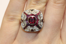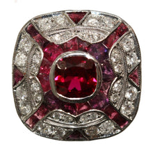 A Tresors original design, this Cocktail Ring showcases a unique and one-of-a-kind design that is sure to catch the eye. The bezel setting ensures that the Ruby is securely held in place, while the halo of Rubies and Diamonds adds a touch of sparkle and glamour.