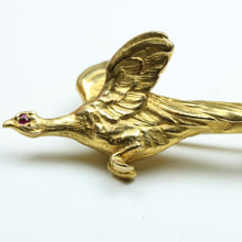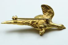Our Gold and Ruby Bird Brooch is a stunning piece that showcases exquisite craftsmanship and attention to detail. Made from 9ct carved yellow gold, this brooch features a singular bird in flight, capturing the beauty and grace of these magnificent creatures.