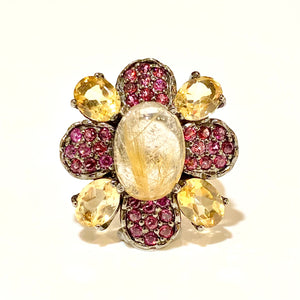 Sterling Silver Black Rhodium Plated Rutile Quartz, Citrine and Tourmaline Ring
