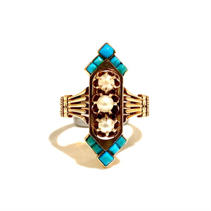 Antique 14ct Rose Gold Turquoise and Seed Pearl Etruscan Style Ring