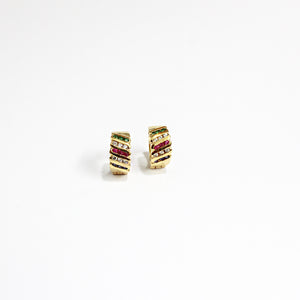 Vintage 18ct Yellow Gold Red, Green, Blue and White Cubic Zirconia Sleeper Hoop Earrings