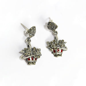 Sterling Silver Marcasite and Enamel Flower Basket Stud Drop Earrings