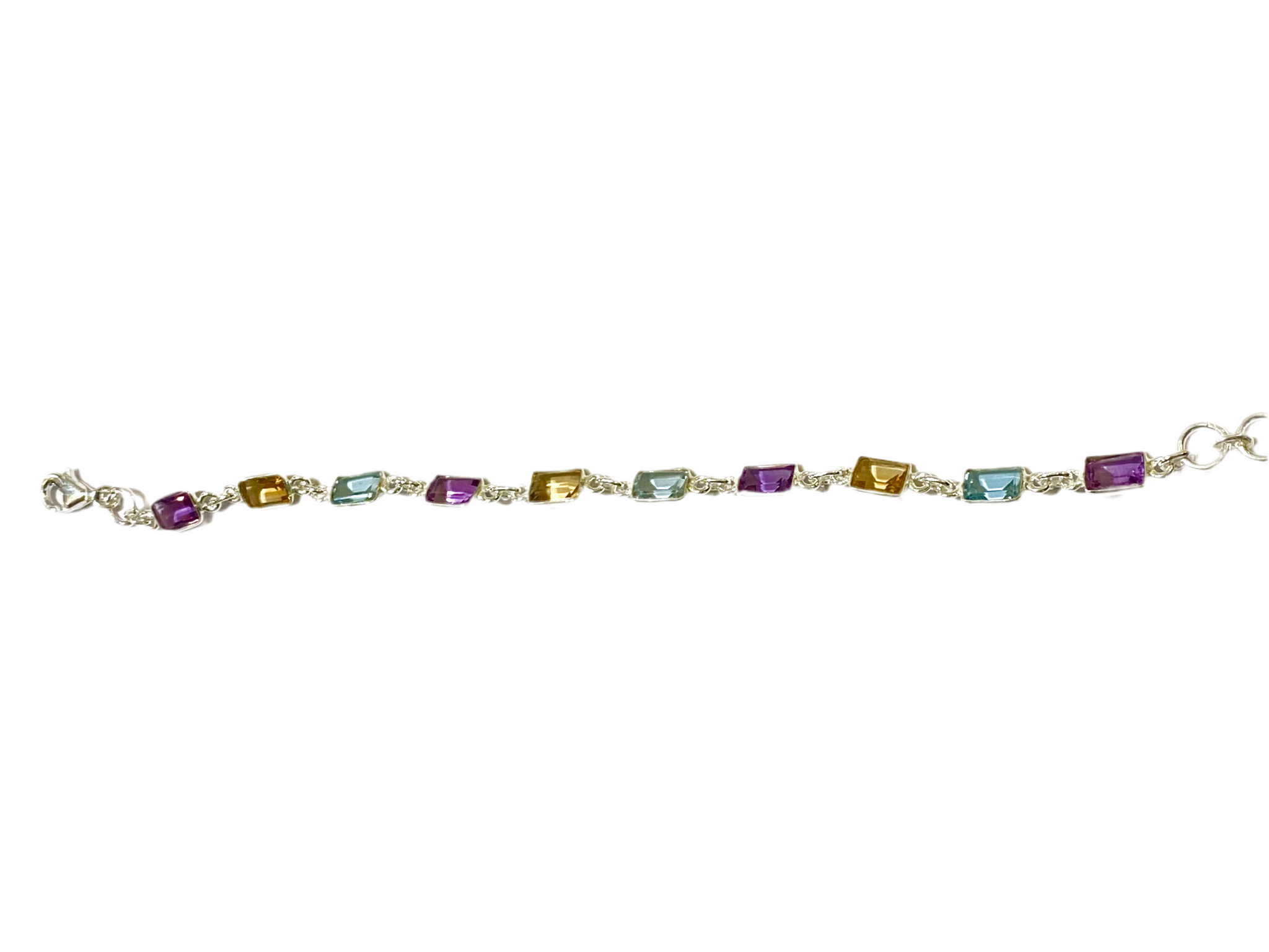 A classic design with rich colours and timeless appeal. This elegant Citrine, Amethyst and Topaz bracelet features a row alternating gems in polished sterling silver. The vibrant gemstones are beautifully faceted to catch the light, giving this bracelet a refined yet striking presence on the wrist. Perfect worn alone or layered with other silver pieces.