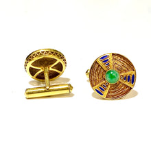 14ct Yellow Gold Filigree Jade and Enamel Cufflinks are a beautiful pair of cufflinks made from 14ct yellow gold, featuring intricate filigree work, jadeite gemstones, and blue enamel.