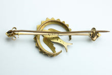 Our Antique Seed Pearl Crescent Bird Bar Brooch is a stunning piece crafted from 9ct yellow gold. It features a unique design with a bird in a crescent shape positioned in the centre of the bar. The bird is adorned with twelve pearls on its body and wings, creating an elegant and intricate look.