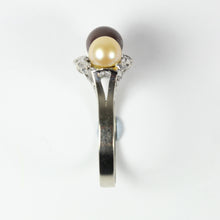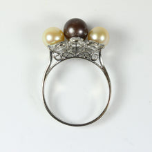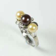 Our Vintage Trilogy 14ct White Gold Black Tahitian and Cultured Pearl Ring is a stunning piece of jewellery that exudes understated elegance. Crafted from 14ct white gold, this ring features a trilogy design with one black Tahitian pearl and two cultured pearls.
