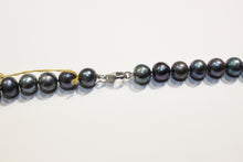 Our Peacock Blue Pearl Necklace is a stunning piece of jewellery that will add timeless elegance to any outfit. It features freshwater pearls that are strung on silk, measuring 10-13mm wide. The necklace itself measures 45cm long and is finished with a Sterling Silver clasp.