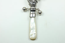 Our Sterling Silver Mother Of Pearl Jester Rattle is a beautiful and traditional Christening gift. Crafted with sterling silver and adorned with a mother of pearl handle, this rattle is a timeless piece that will be cherished for years to come.