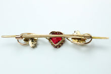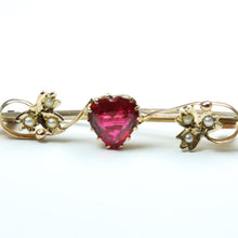Our Tourmaline and Pearl Bar Brooch is a beautiful piece of jewellery made from 9ct rose gold. This brooch features a singular tourmaline in the shape of a heart, positioned in the centre of the brooch.