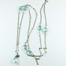 Designed with an antique platinum setting, this necklace showcases intricate craftsmanship and attention to detail. The platinum setting enhances the brilliance of the aquamarine paste gems and complements the lustrous faux seed pearls.