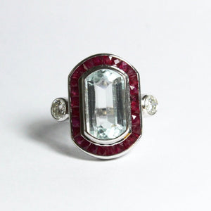 9ct White Gold 4.6ct Aquamarine, Diamond and Ruby Cocktail Ring