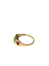 This charming ring showcases a luminous opal whose shifting colours glow with natural beauty, accented by the rich red sparkle of round-cut rubies. Crafted in 9ct yellow gold, the warm setting enhances both gemstones, creating a timeless piece that balances elegance and vibrancy. Perfect as a unique gift or a treasured addition to your jewellery collection.