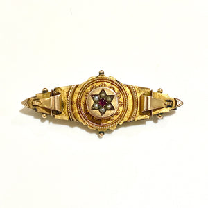 Antique 9ct Yellow Gold Ruby and Seed Pearl Victorian Mourning Brooch