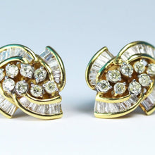 Our 9ct Yellow Gold Fancy Cut Diamond Stud Earrings are a stunning accessory that will add elegance to any outfit. These earrings feature a unique design with 8 Brilliant Cut Diamonds in the centre, surrounded by spiral fan outs of 9 Baguette Cut Diamonds.