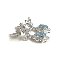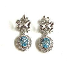Our 9ct White Gold Blue Topaz and Diamond Bow Earrings are a stunning pair that feature a beautiful bow design at the top, with a round blue topaz stone surrounded by sparkling diamonds at the bottom.