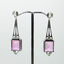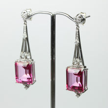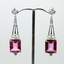 Our Pink Topaz and Diamond Drop Earrings are a stunning pair crafted in Deco Style 9ct White Gold. These earrings feature a beautiful pink topaz gemstone surrounded by sparkling diamonds.