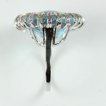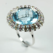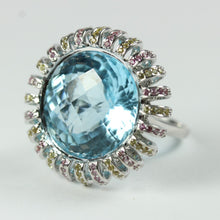 Our Swiss Blue Topaz, Pink and Yellow Sapphire Ring is a stunning piece of jewellery crafted in 9ct White Gold. It features a round cut Swiss Blue Topaz stone surrounded by vibrant yellow and pink sapphires.