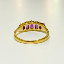 This elegant ring is crafted in 9ct yellow gold and showcases 5 vibrant oval cut amethyst gemstones, creating a striking and eye-catching look. The bridge design adds a modern twist to the traditional ring style, making it a unique and stylish accessory for any occasion.