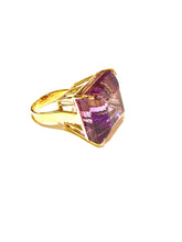This ring is a true statement piece, with its bold design and eye-catching amethyst stone. The square cut amethyst is 49ct in size, making it a sizable and luxurious gemstone. The amethyst stone is set in a 9ct yellow gold gallery that adds elegance and sophistication to the overall design of the ring. The upward struts of the gallery enhance the visual appeal of the ring and give it a unique and modern look. The wide band of the ring adds comfort and stability, making it suitable for everyday wear.